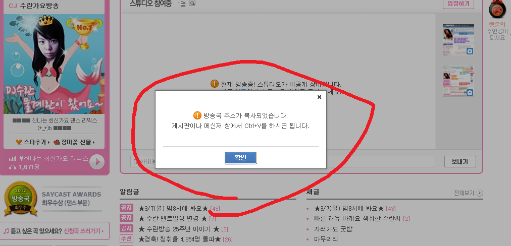 저게 방송주소인데요~~ 주소복사 버튼을 누릅니다