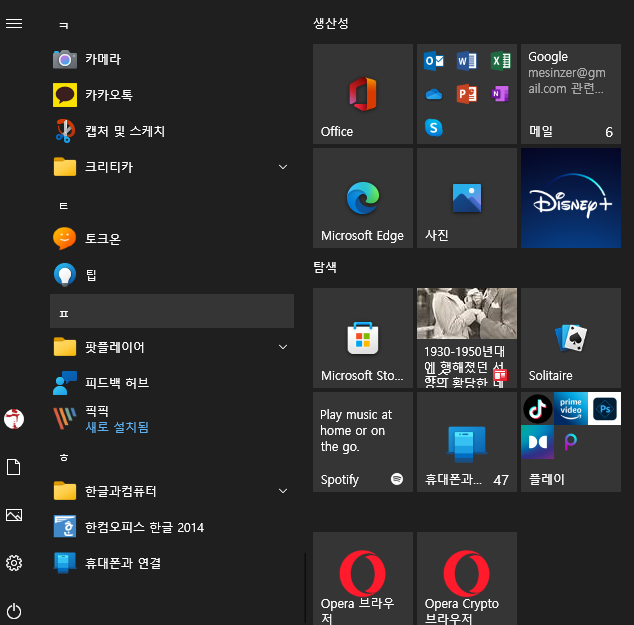 고딕체로 세팅된 시작메뉴 부위