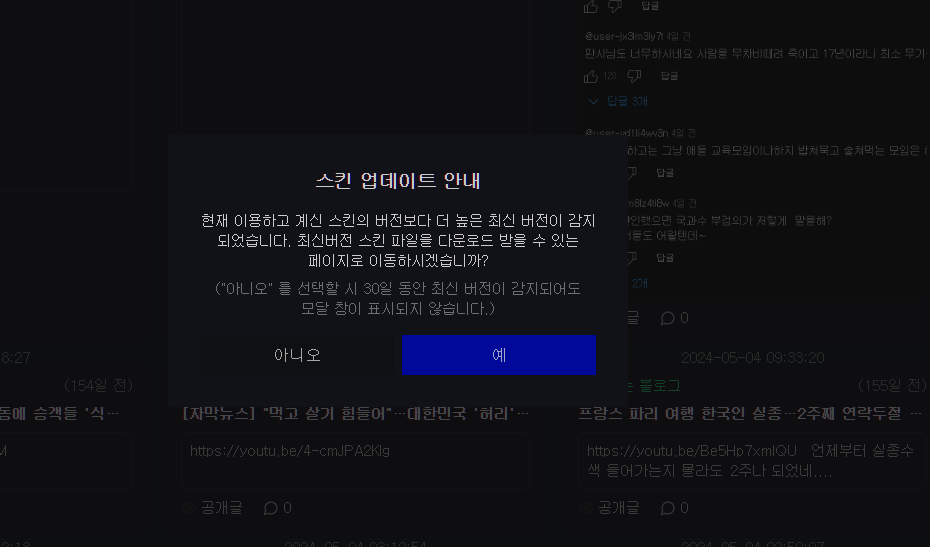 현재 이용하고 계신 스킨의 버전보다 더 높은 최신 버전이 감지 되었습니다. 최신버전 스킨 파일을 다운로드 받을 수 있는 페이지로 이동하시겠습니까?