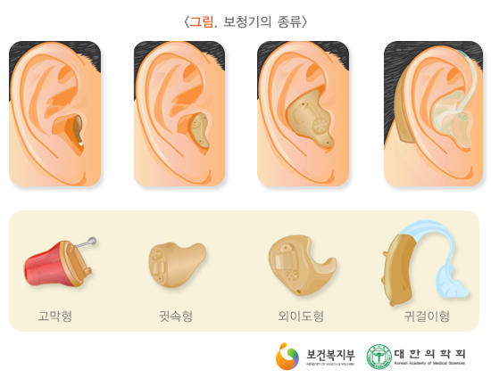 보청기는 형태와 크기에 따라 귀속형 보청기, 고막형 보청기, 외이도형 보청기, 귀걸이형 보청기 등으로 나눌 수 있습니다.